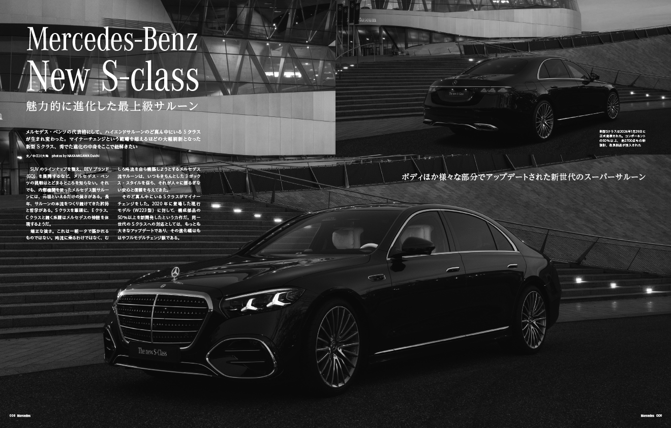 2020年に登場した現行モデル(W223型)に対して、構成部品の50%以上を新開発。同一世代のSクラスへの対応としては、もっとも大きなアップデートであり、その進化幅はもはやフルモデルチェンジ級だ。