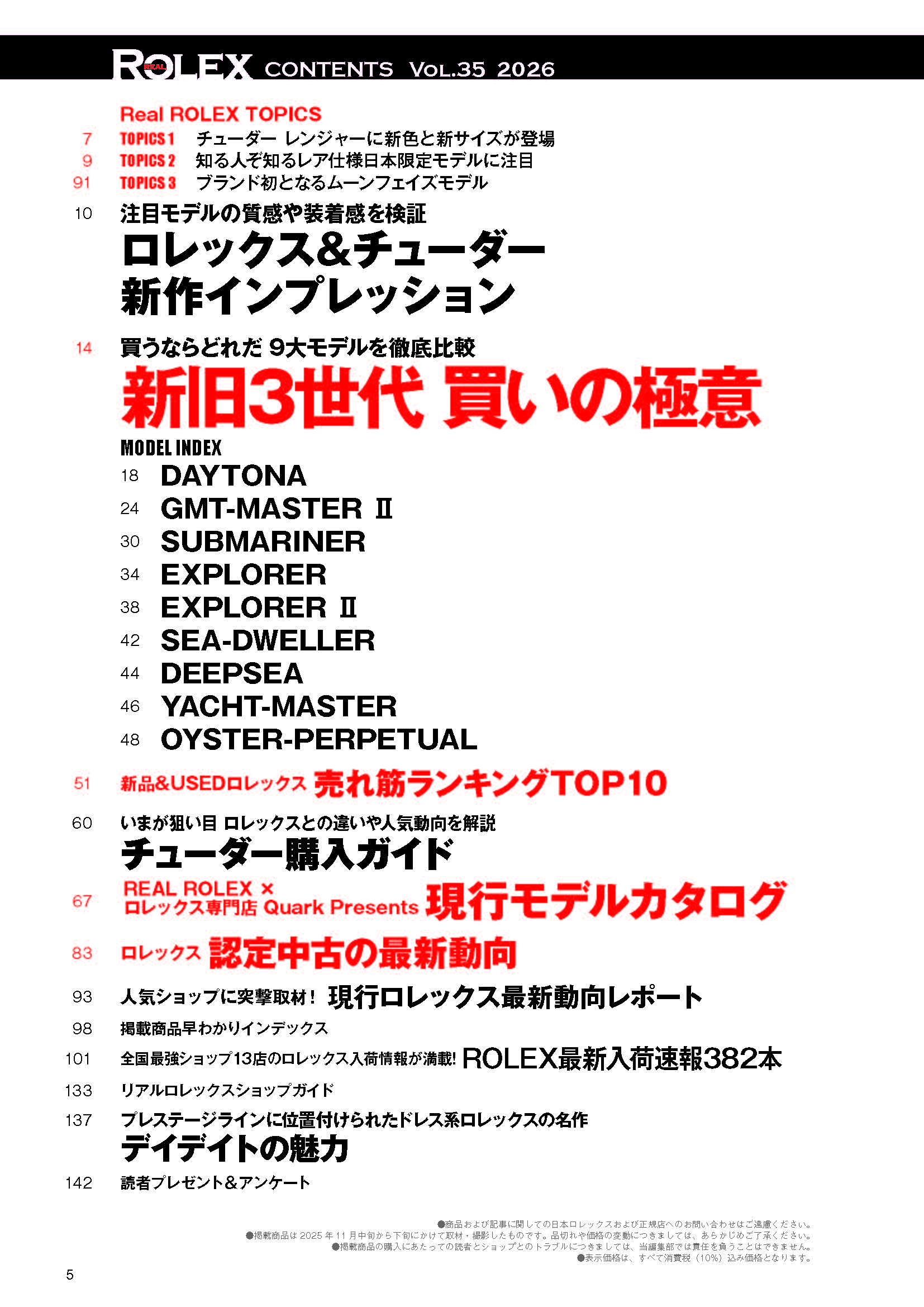 大特集以外では、ロレックスの普及版ブランドである“チューダー”に注目して、本家ロレックスとの違いや魅力を深掘りした【いまが狙い目、チューダー購入ガイド】など、特集記事も注目です。